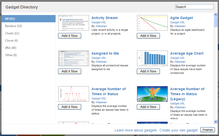 When you're ready to chose a gadget, click on the Add button for that particular gadget to add it to your dashboard.