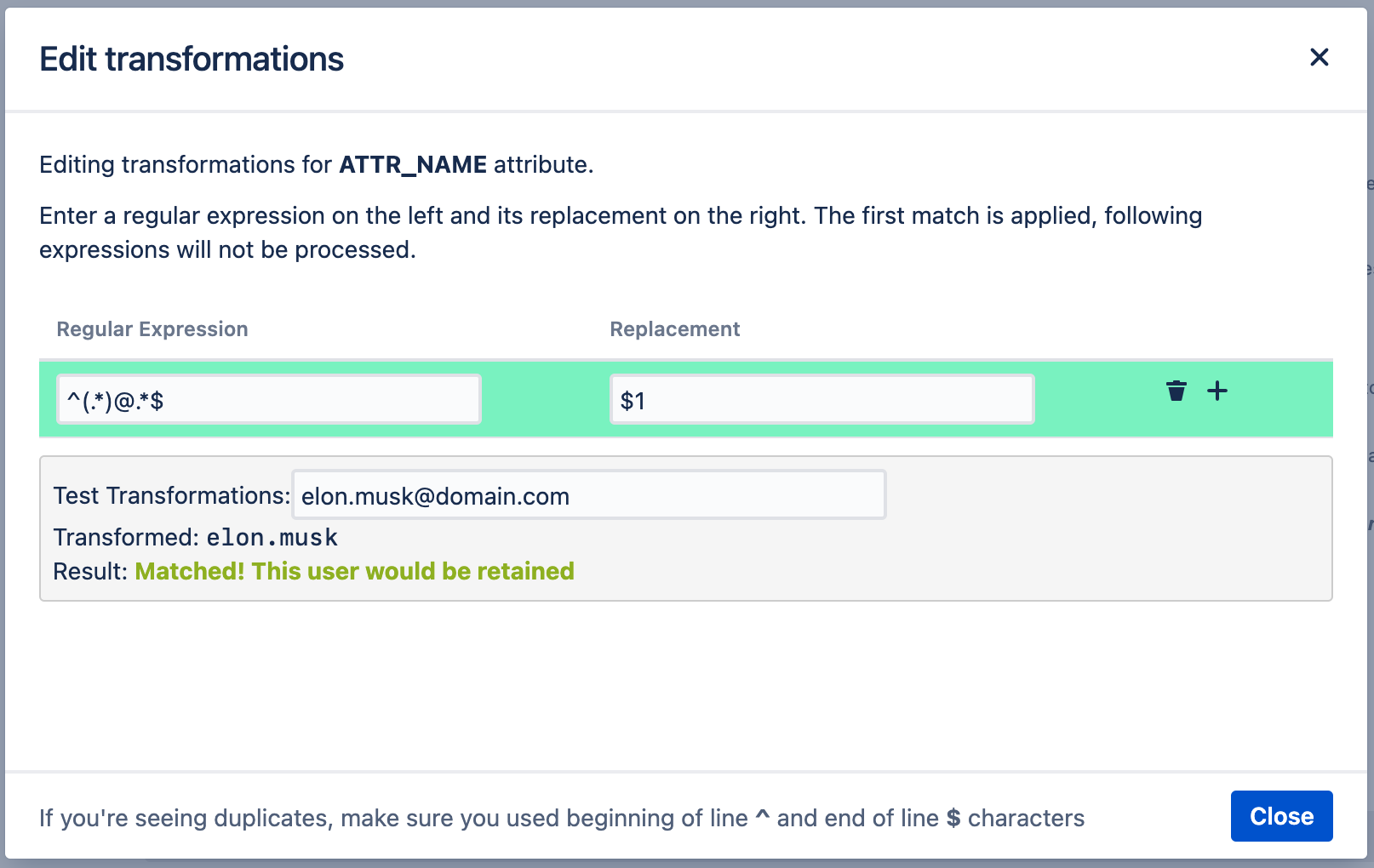 - Now it’s time to add the transformation. Here’s the regex example that would do the job of transforming elon.musk@acme.com into elon.musk: